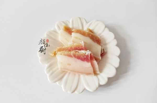 第五步:咸肉是提前醃制好的,切一些洗凈,然後切成薄片。