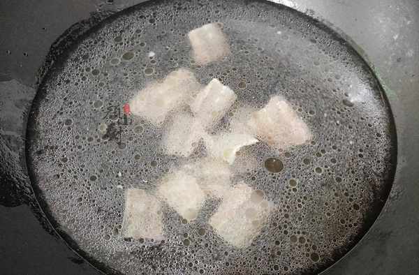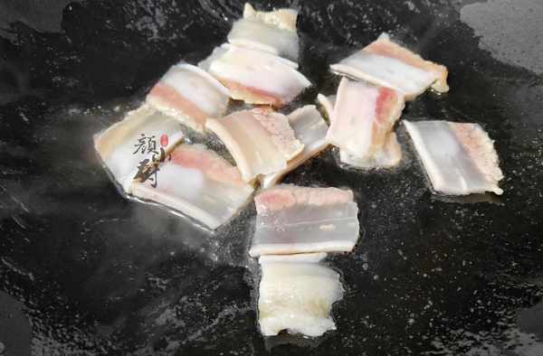 第六步:鍋中倒入少許食用油燒熱,把切好的咸肉倒入鍋中翻炒均勻變色。