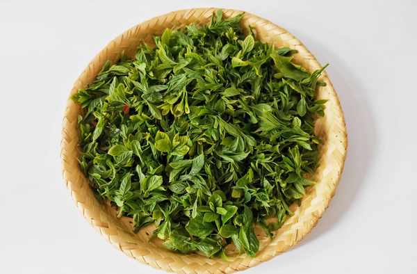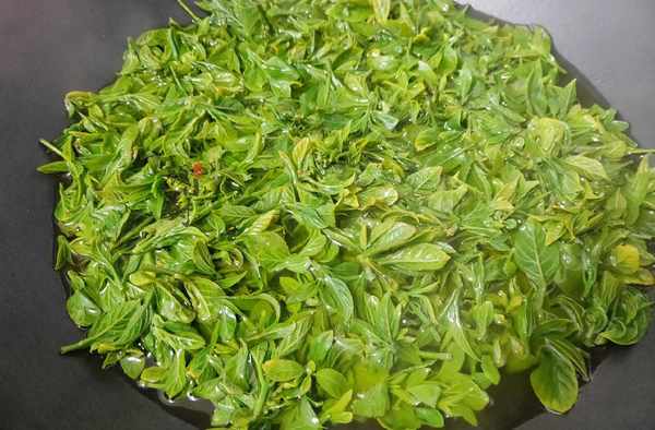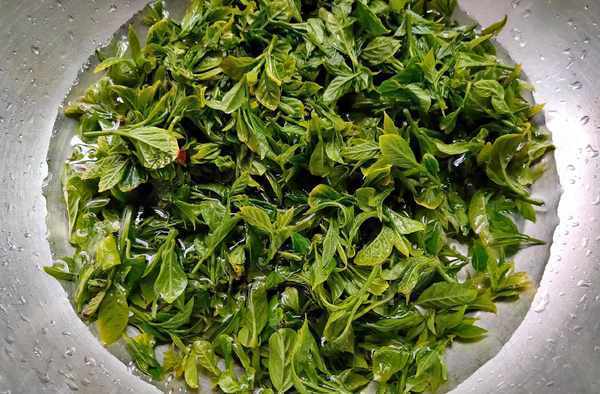 第一步:首先把摘回來的大青葉,摘去老樹枝,隻留嫩的部分。