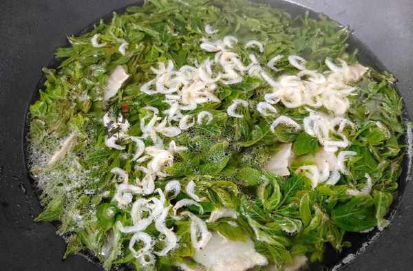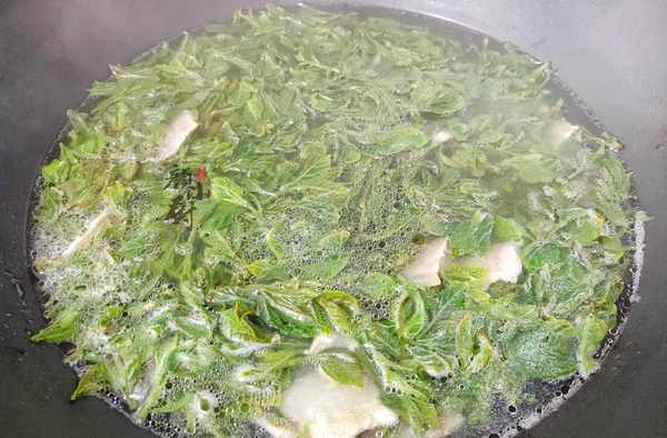 第八步:煮開後把大青葉倒入鍋中煮,再次煮開後。