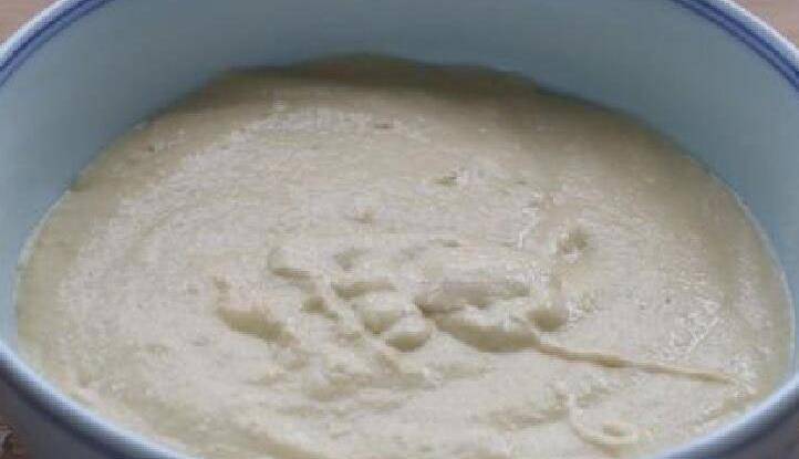 第四步:將打好的蘋果山藥泥倒進碗中,加上50克玉米淀粉,將它攪拌均勻,攪拌至沒有面粉顆粒的面糊,然後放在一旁備用。