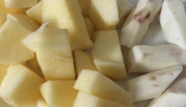 第一步:準備一個蘋果清洗幹凈之後用削皮刀削去皮,準備一根山藥清洗幹凈之後同樣削去皮,山藥去皮的時候可以戴上手套,防止手發癢,都去掉皮之後用清水清洗幹凈。