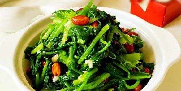 4.放入菠菜梗翻炒,時間不要長,感覺變色就可以