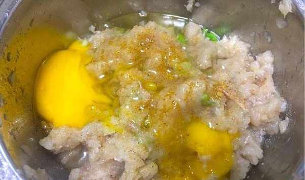 把蔥薑切末放入盆中,倒入剁好的鮁魚肉末和適量的淀粉,再打入兩個雞蛋,加上適量的十三香和少量的鹽沿著一個方向攪拌均勻。