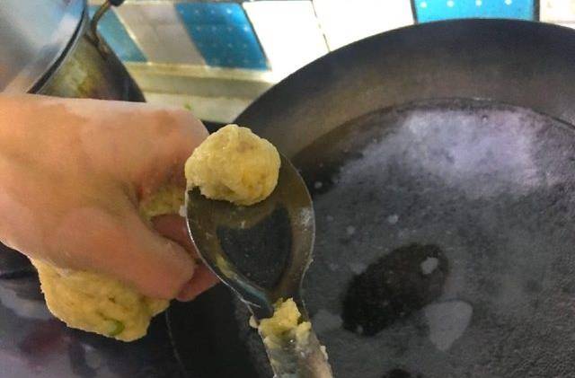 魚肉醃十來分鐘,鍋中加入適量的水,大火燒開後一手拿著魚肉在手的虎口處擠出圓形的魚丸,另一隻手拿著勺子將魚丸放到燒開的水中。