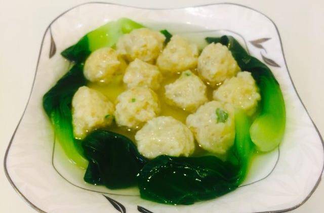 將油菜用筷子夾出,擺在盤子的周圍,造型根據個人愛好擺放即可,然後把湯澆在丸子上,滴上幾滴香油即可。