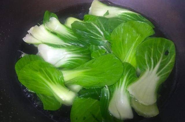 將洗好的小油菜放到水中煮熟,加入少量的鹽和雞粉調味兒。