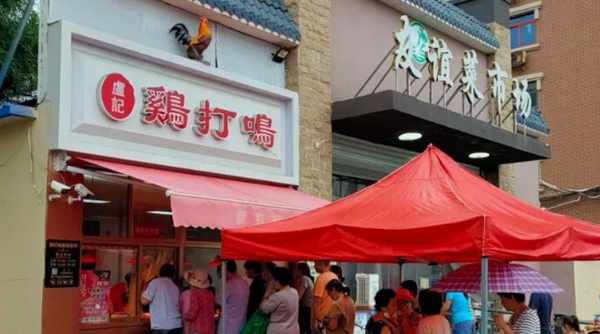 這家小熏雞店就是赫赫有名的"雞打鳴",名字起得也很有特色,店面裝修的更是別致,一隻大公雞傲立在門口上方,很遠就能看見,除了老熟客,還有不少過路的路人,則是聞著他家散發出來的香味,又很好奇這這家店熏雞到底有什麼魔力,這麼多人排長隊,也湊熱鬧來嘗嘗。