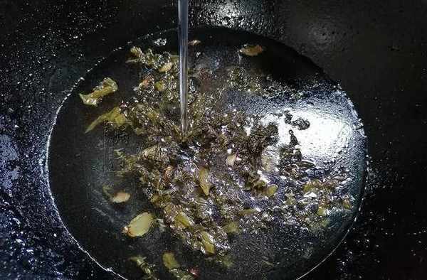 4.第四步,加入開水。翻炒過後,大蒜和生薑的香氣均勻遍佈酸菜之中,此時註入開水,準備開始熬湯。註入開水的時候,湯水表面略卡有油面,但不用著急,一會兒處理過後,它們將變得十分可口動人。