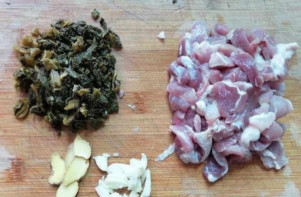 1.第一步,準備食材。先將準備好的酸菜和豬肉放入空盆中洗凈,然後酸菜切碎,豬肉切片,生薑和大蒜同上。