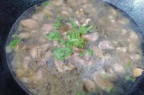 9.第九步,出鍋裝盤。酸菜肉片,整道菜顏色偏暗,不過勝在最後可以用芹菜葉子點綴,看起來仍舊有著夏日的活力。輕嘗一口,酸菜的酸爽和肉片的鮮美皆融入湯中,一口之下意猶未盡,起筷夾出肉片,此肉入口順滑,好似視口腔為無物,一經入口還不及細嚼,它便匆匆帶著香氣直滑喉嚨,實在叫人驚嘆。美味至極。