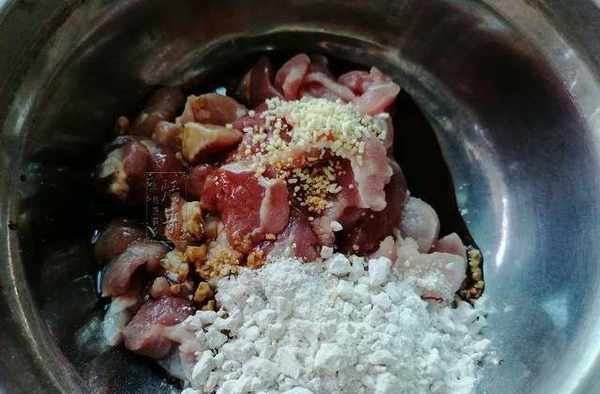 5.第五步,為豬肉裹粉。做酸菜瘦肉梗時,不要直接下入瘦肉,那樣煮出來太柴,下水煮制前把瘦肉放到盆中,加入醬油、食鹽、雞精等調味品,最後再撒入淀粉抓勻,讓淀粉勻稱地裹在瘦肉上,鎖住調味品帶來的味道。這樣子瘦肉吃起來會更有滋味。大傢如果是第一次制作,裹粉的時候可以參照炳哥拍攝的圖片,抓到那個程度就可以瞭。