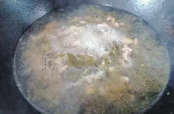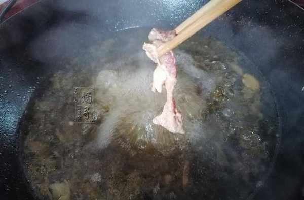 7.第七步,轉火靜等。肉片下入後,先是大火,讓它沸騰個兩三下再轉入中小火。大火沖出豬肉的鮮味,再轉成小火是將其香氣鎖住,復又將它融入湯中,這樣湯汁喝起來酸爽可口,宛若有天下極品的氣象。