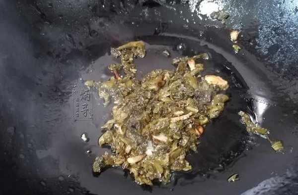 3.第三步,下入酸菜翻炒。爆香之後,兩類配料的味道直沖而起,不著急下肉,先將酸菜放入,讓他和兩者撒丫子狂歡。