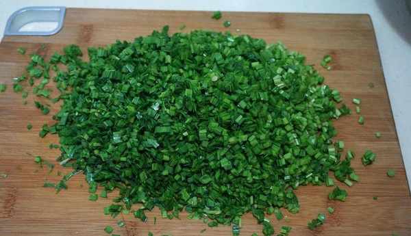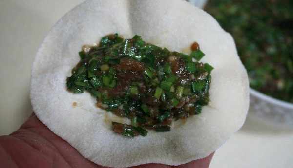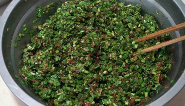 6.韭菜入肉餡盆中,包之前再混合,防止出湯;