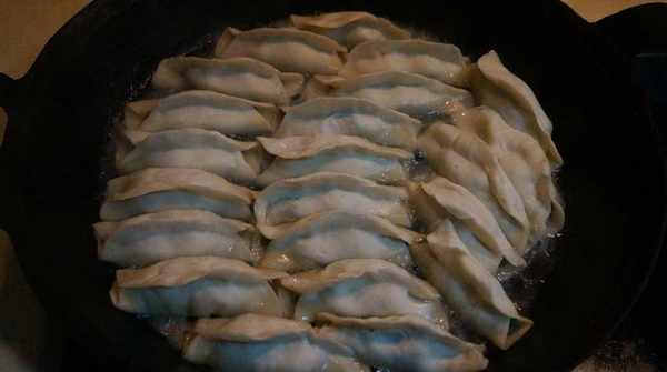 11. 平底煎鍋中放少許油,將包好的鍋帖生坯底部蹭油鋪滿整個鍋底;