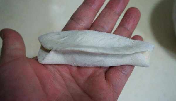 10. 將皮子放在案板上,將中間捏緊,兩邊留小口,再略微往兩邊抻一下成細長條狀;