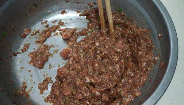 4.餳面的時候調餡:肉餡中打入適量的清水,再加入醬油、蠔油、鹽、少許植物油,調成糊狀;