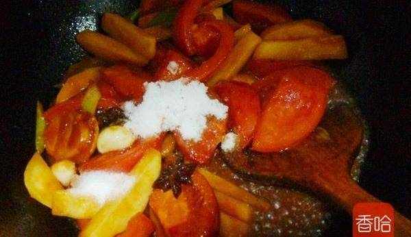 6.放入西紅柿,土豆,加醬油,料酒,放白糖,鹽,煸炒。