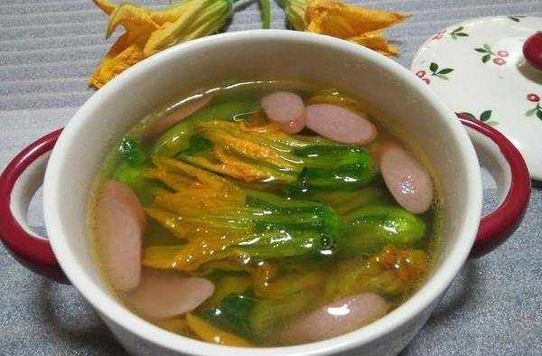 做法:南瓜花去幹洗幹凈,牛肉腸切片,鍋中燒開水放入薑片牛肉腸煮5分鐘,加入南瓜花煮熟放鹽雞精即可。