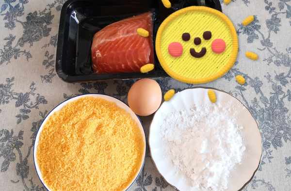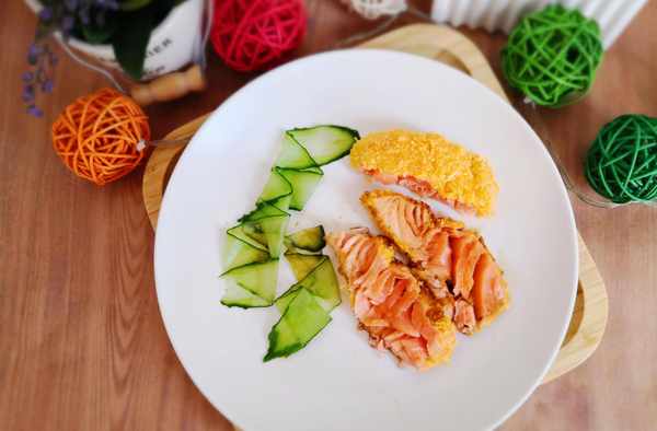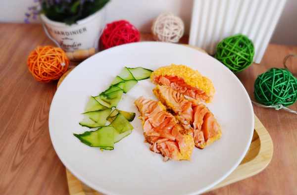 食材:三文魚100克,玉米淀粉適量,雞蛋1個,面包糠適量,黃瓜片少許,醬汁適量