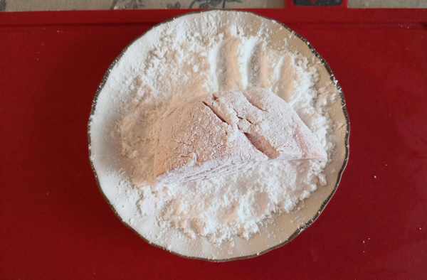 2. 三文魚先裹上一層淀粉,