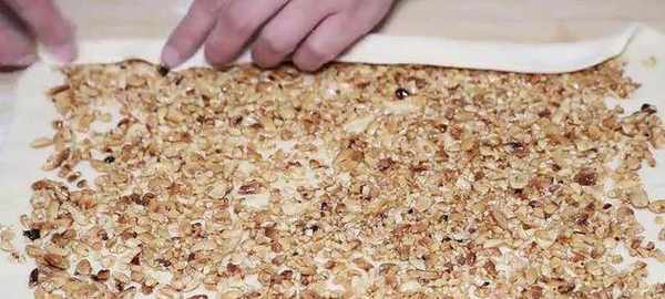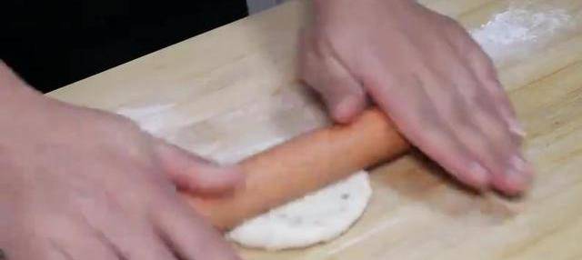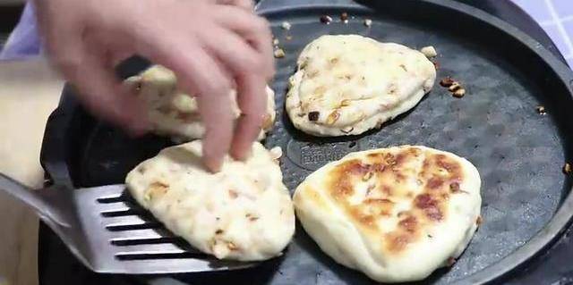 最後要改成這種長方形。再放上天。好的花生餡料均勻地塗抹開。然後從底部給它卷起來,兩邊的口用虎口戳給他包起來。再按一下,用搟面杖搟薄,再給他轉兩下。做好的餅皮,再蓋上保鮮膜醒10分鐘,店面城裡刷入食用油,註入新和的餅皮。筷子烙兩分鐘,兩分鐘後再給他翻個面,太香瞭。