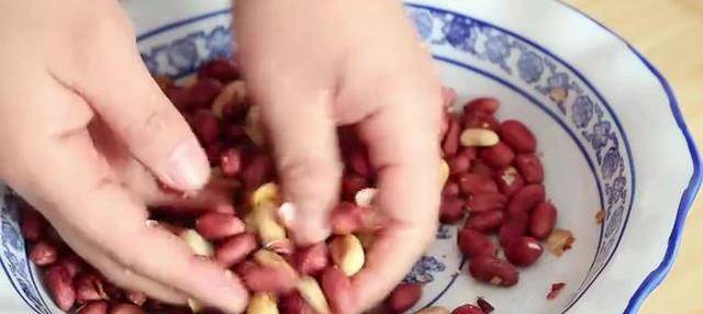 等到花生米完全變涼瞭,再給它脫掉紅外衣。這裡有一個小小的建議給大傢說一下,血液黏稠的朋友們在吃花生米的時候一定要去掉外面這一層皮,因為它可以增加血液的黏稠度,花生米處理好瞭,放入保鮮袋裡,用搟面杖給它壓碎。之後再倒回大碗裡加入一勺的花椒粉,一勺食用鹽,少量的食用油,攪拌均勻,放在旁邊備用。