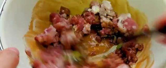 切成4個面記,揉成一個餅,刷一點油,邊緣部位不要刷,撒一點幹面粉,然後像包子一樣給它包起來,蓋上保鮮膜,二次醒發10分鐘,二次醒發的功夫,我們來調制點肉餡,準備三兩肉餡放入蔥花,加耗油生抽鹽,一個方向攪。我們殺過水的白菜,放到肉餡裡面,加一點香油。