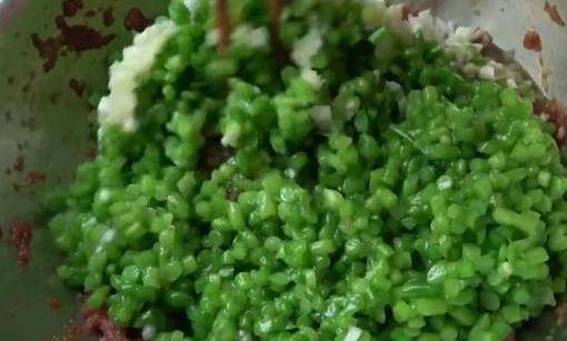 然後把蒜苔切碎,切好的蒜苔倒進肉餡,再加入蔥末,香油,玉米油,適量鹽,充分攪勻。備用。