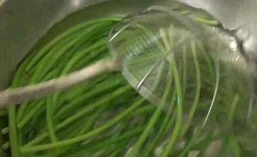 攪勻後,醃制10分鐘。鍋裡燒水,然後把蒜苔擇去頭尾,清洗一遍,鍋裡水開後,把蒜苔倒入,焯水30秒,去一下蒜苔的辣味。