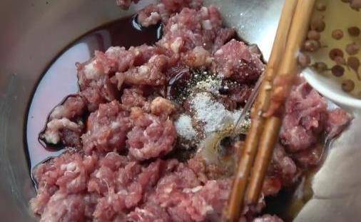 利用醒面的時間,先把前腿肉去皮清洗幹凈,剁成肉末,然後裝進碗裡,進行調味:往裡加入1勺生抽,半勺老抽,半勺蠔油,根據自己的口味加鹽,倒入花椒水(花椒水分多次倒入)攪拌均勻。