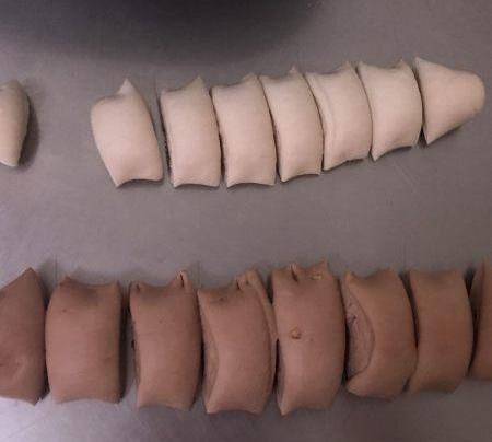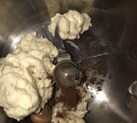 取出一半左右面團,剩下的再加入可可粉和巧克力,繼續揉2分鐘。