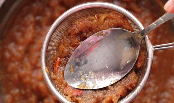 接下來,我們將煮好的梨過濾一下,在小篩網中,用勺按壓,將大塊的雜質過濾出來。