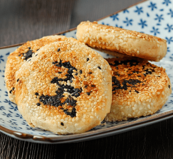 老漢口酥餅,又被稱為堿酥餅,因有特制的脂烙酥而得名,酥餅外表呈金黃色,脆而不碎,油而不膩,香酥適口。堿酥餅餅皮料用糯米麥芽糖、上等面粉、植物油;餡料用黑芝麻、桂花、陳皮、白糖、麻油等原料。這種堿酥餅必須用傳統的七星爐反復進行烘烤,嚴格掌握火候,吃起來皮酥有層次。