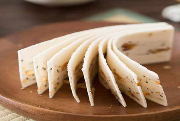 雲片糕又名“雪片糕”、“桃片糕”,其名稱是由片薄、色白的特點而來的。外形如一片一片雲朵,猶如凝脂,觸感綿軟細膩,味道清甜可口,細細品嚼,舌齒間縈繞的糕香令人回味無窮。雲片糕是南方許多地區的傳統糕點美食,因所在產地不同在做法上也有些微差別,各個地區的雲片糕都有自己的特色。