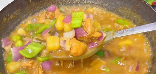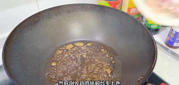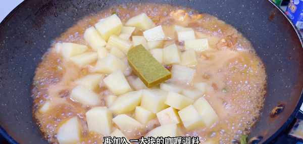 鍋裡倒入適量的油,放入幾塊冰糖,把冰糖炒至融化,炒出糖色,然後倒入雞肉塊翻炒至上色,不管炒什麼肉,我們加入少量的冰糖,既可以去腥,而且還可以提鮮,吃起來是非常的香。翻版均勻之後加入生抽和蔥薑蒜再一起翻拌均勻,盡量多炒一會兒,這樣雞肉更容易入味,然後倒入一碗熱水,喜歡吃湯汁拌飯的可以多加一點熱水,然後倒入土豆塊,再加入1大塊的咖喱調料,這個味道是我傢閨女最喜歡吃的。蓋上蓋子,燜上十分鐘。