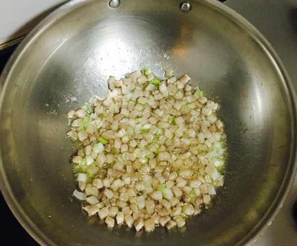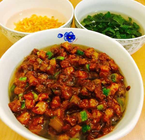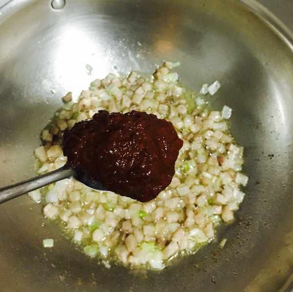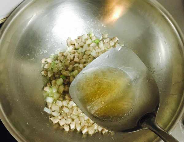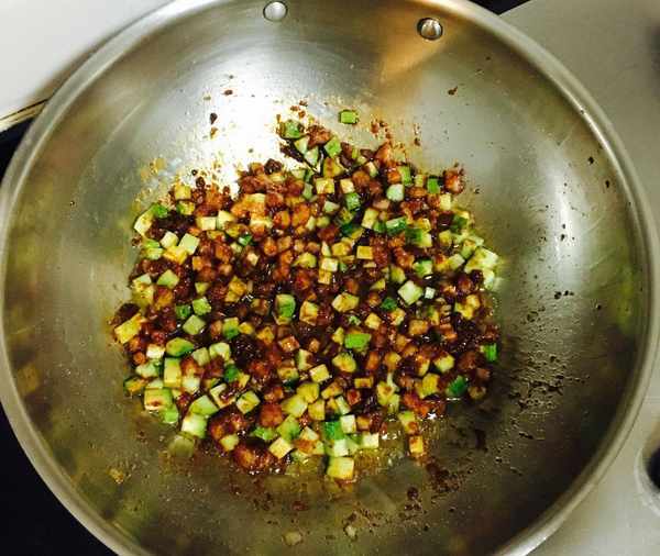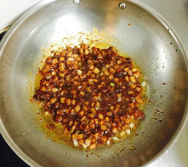 熱鍋加花生油放入肉丁煸香出油,放入蔥花爆香,烹入料酒,改小火放入甜面醬,把甜面醬炒香