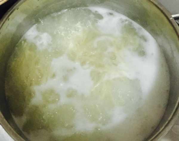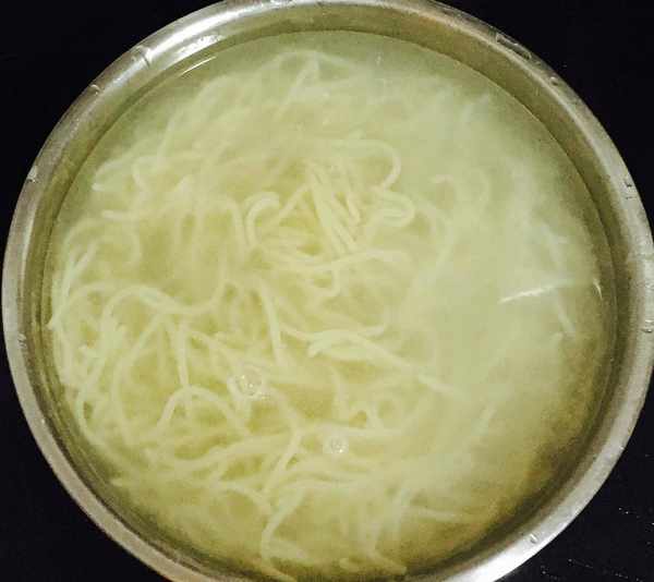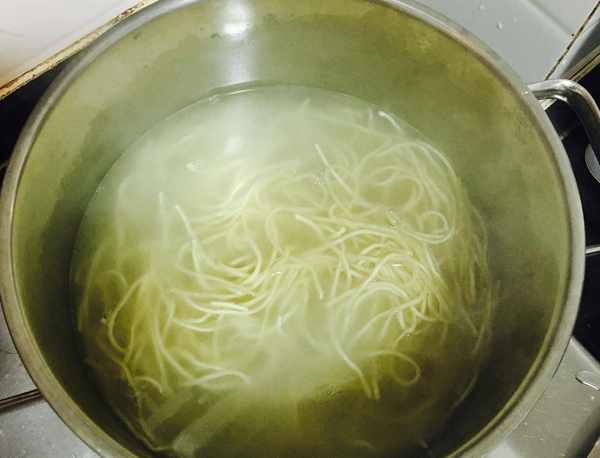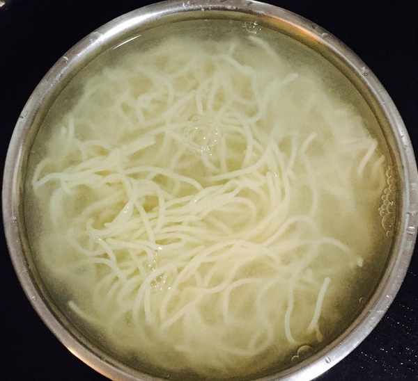 開始煮面,鍋中加水煮沸下入面條,點涼水兩次分別煮開即可,面條煮的軟硬程度根據自己的喜好來決定