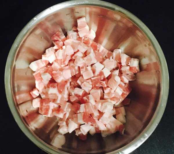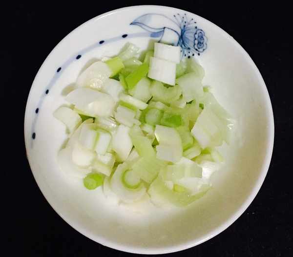 黃瓜一根用水清洗幹凈先切條再切成小丁,大蔥剝去外皮清洗幹凈切成蔥花,五花肉切丁
