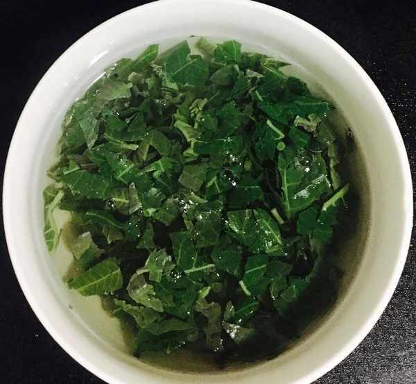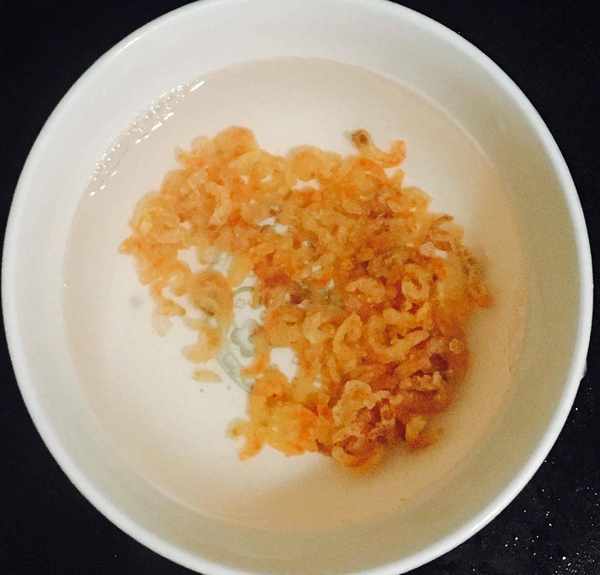 海米用清水沖洗一下,冷凍的新鮮香椿化凍後沖洗幹凈切成末,海米和香椿分別放入碗中倒入開水浸泡出味兒