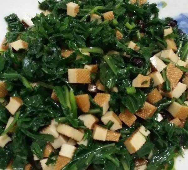 用料:野菜1把、豆腐幹2片、幹辣椒適量、麻椒適量、食鹽適量、味精適量、植物油少許。