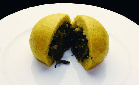 3.取一份玉米面團用手按扁,加入適量餡料,包好後用手滾圓,依次完成所有。