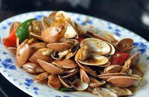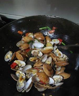4、炒貝類,盡量不要用炒勺或者鍋鏟頻繁翻動,而用顛鍋的方式來大火爆炒,這樣貝肉不容易和貝殼分離。