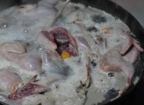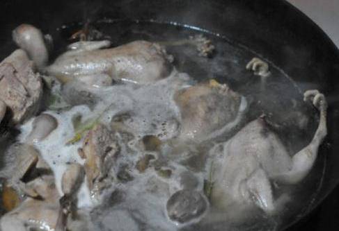 第四步,等煮久瞭後,表面就會出現很多的泡沫,這些泡沫是鵪鶉血裡面臟臟的東西,出現泡沫之後就可以把鵪鶉撈出來瞭,撈出來後把鵪鶉用清水洗幹凈。