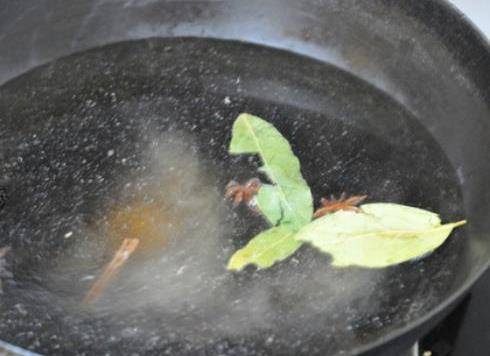 第五步,把鍋厘米的水倒掉,再重新倒適量的清水在鍋中,再鍋裡面放入準備好的桂皮、香葉和八角,等水煮開。