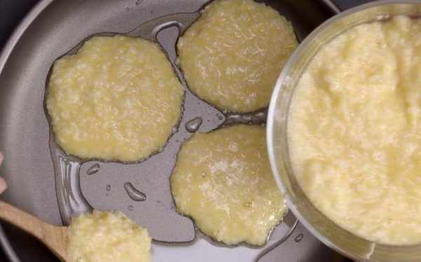 第三步:平底鍋刷一層食用油,預熱三成熱後,按照下面這張圖的操作,用勺子把蛋液米飯平鋪在鍋中,形成一塊直徑10厘米左右的圓餅即可。