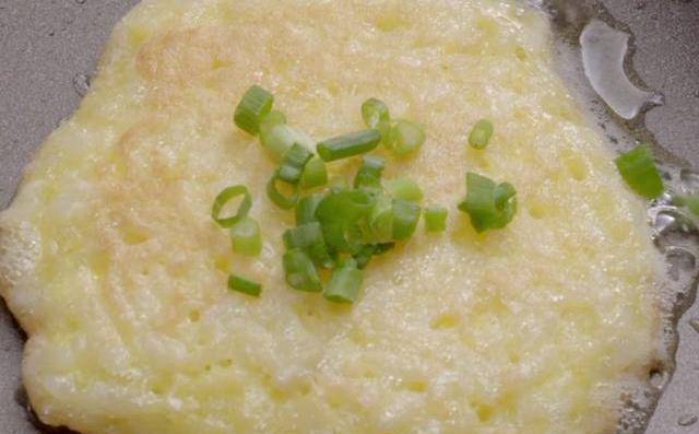 第四步:最後煎至兩面金黃凝固,撒上一些蔥花,稍微煎至蔥花冒出香味,就可以出鍋品嘗瞭。