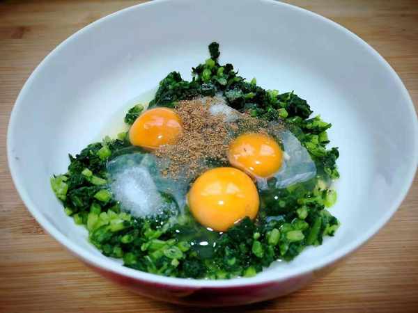 3、茼蒿丁放入一個大碗中,打入3個雞蛋,少許鹽,胡椒粉。