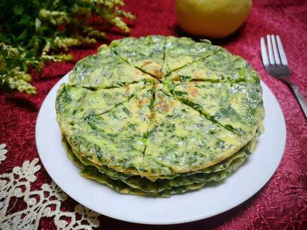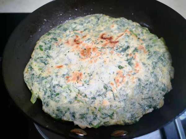 5、在平底鍋中刷上少許的食用油,用勺子將茼蒿面糊放入在鍋中,整理成圓形餅胚,小火慢慢煎,底部定型微黃,翻面繼續煎一會即可,鍋後又酥又軟,香味濃鬱,特別的好吃有營養,好吸收又好消化。